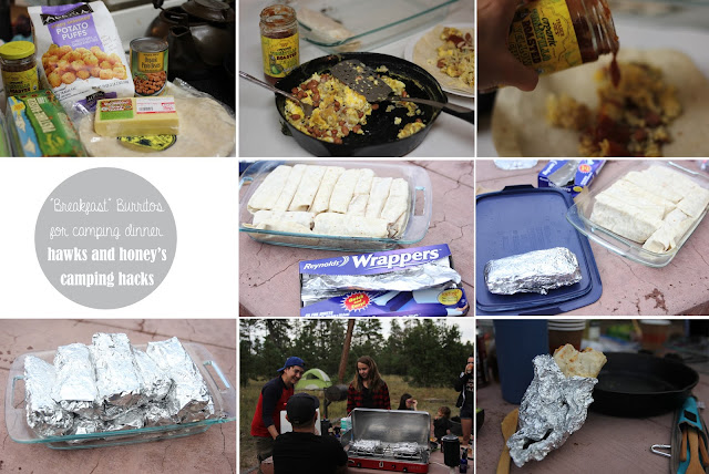 I decided ahead of time to make some breakfast burritos for the trip so we wouldn't have to cook too much since we didn't want to have to do dishes and I thought it would be better than trying to prepare a meal for a bunch of people outside without all of our regular kitchen utensils. I actually used tater tots in the burritos so I wouldn't have to spend time cutting and cooking potatoes. I just fried them a bit in coconut oil and then added eggs and beans and cheese topped with salsa wrapped in an easy to heat tin foil shell. next time, I'd use the grill at the site, because our cooking stove top gets hot quickly. anyway, they were delicious and I added avocado in the evening.
